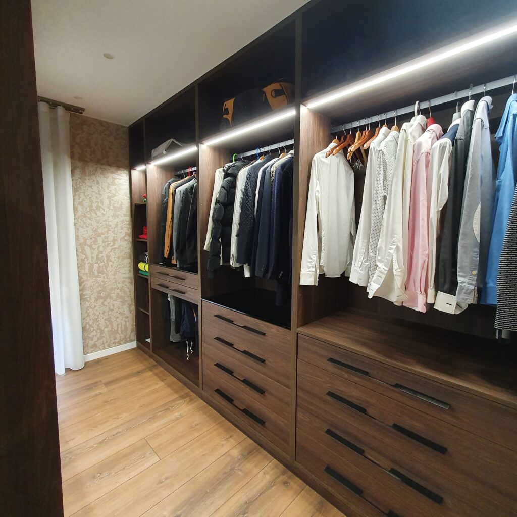 Cada armario y vestidor se concibe pensando en el espacio y las necesidades del usuario. La selección de materiales y acabados, junto con soluciones de almacenamiento inteligentes, permite crear espacios organizados que optimizan la funcionalidad sin sacrificar el estilo.